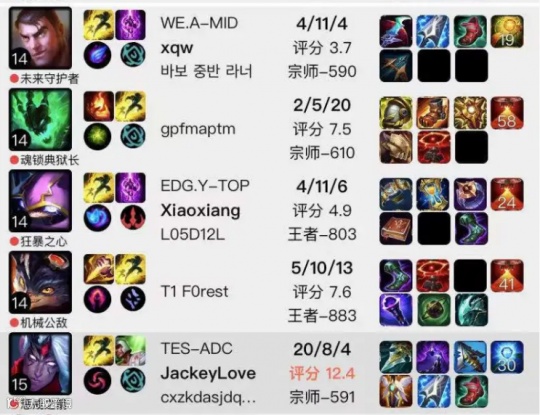 这一场对局xiaoxiang的凯南发挥得就极为绿色,4-11的战绩与同为4-11的中单杰斯堪称卧龙凤雏。阿水的韦鲁斯则血C一把撑住了场子,击杀数比剩下四个人加起来都多就很说明问题了。
