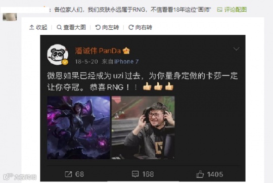 在潘诚伟画师本人看来,这只是他在用自己的专业能力祝贺RNG夺冠的个人行为,但饭圈粉们却因为他官方画师的头衔而畏惧这种表示祝贺的方式。去年Uzi宣布退役后,潘诚伟也曾以私人名义制作了一幅画作,结果同样引起了不小的风波。