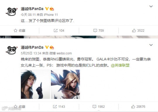 画师潘诚伟将Gala视作LPL的骄傲,微博中还提到了他一直在用咱们LPL自己的冠军皮肤。然而这在部分人看来官方画师为Gala作画,是要“改朝换代”的意思。其中最具针对性的评论,莫过于强调JKL的卡莎才是冠军皮肤的拥有者,且用词非常尖锐。