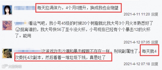 对于这位氪金大佬的悲惨遭遇,不少网友也深有体会,纷纷留言表示“每天拉满体力,4个月0提升,换成我也会绝望”,“每天就4次委托4次副本,然后看着一堆垃圾下线,真是吐了”,“每天都在希望中进副本,然后在失望中退出副本”,“火本是最毒的本”……