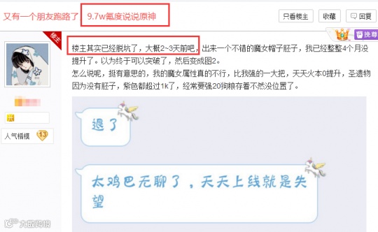 但就在《原神》进入长草期之后,伴随着游戏更新进度的放缓,这位氪金大佬就与朋友陷入了无聊的挖矿与刷圣遗物循环,开始每天上线10分钟的清体力环节,逐渐丧失了当初的快乐。