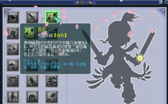 杏花经脉会加强,现在的中毒几率是增加4%,并且能对带“高级毒”的单位起效,其实现在的中毒几率还好,如果再提升毒的几率,应该不太显示,还不如提升一下暗器对人物或者召唤兽单位伤害。由于这个经脉是在第一层,可以惠及到69级的玩家,能增加低组别的可玩性。