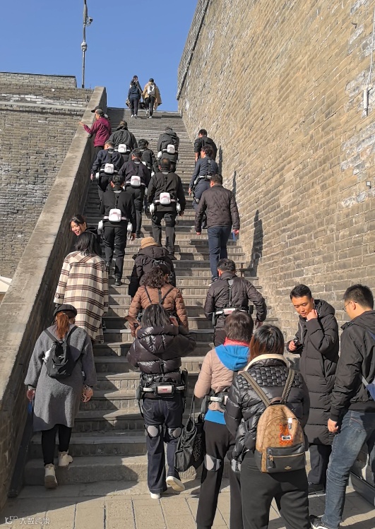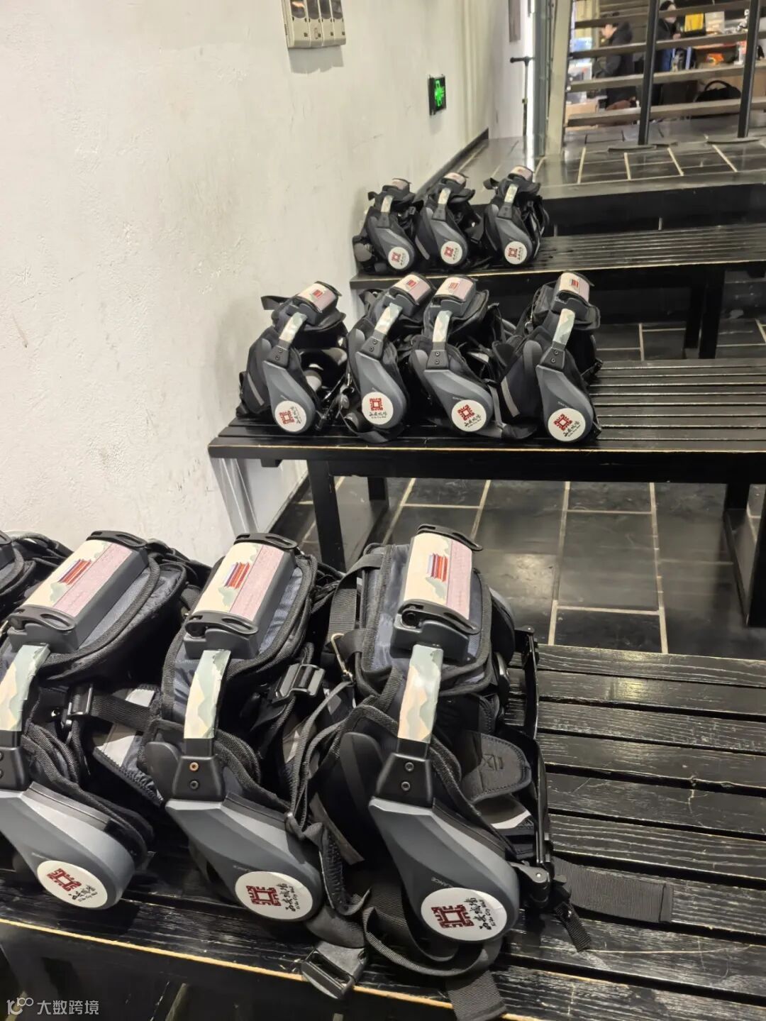 上午 ,游客抵达南门月城游客服务中心 —— 这里早已备好一排外骨骼机器人装备:黑灰相间的肩背式设计,搭配印着标识的便携模块,科技感直接拉满(悄悄说,图里这一排装备,就是咱们今天的 “主角”)。