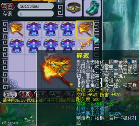 昨天梧桐鉴定了大量的军火资源,几乎全是清一色的160级装备,单加体质29,伤害+520,最关键的还是一把不磨,而且法术暴击几率+0.63%。法暴几率对于传统法系来说还是非常吃香的,虽然伤害有点低,但是感觉单加体质也能弥补一些啊,这武器对于一些任务魔王寨以及龙宫来说还是非常不错的,很香。