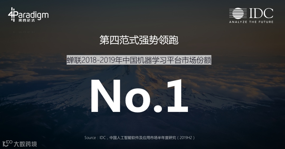 近日,国际权威市场分析机构IDC发布了《中国人工智能软件及应用 (2019 下半年)跟踪》报告,IDC在报告中表示“第四范式市场份额遥遥领先”,远超阿里、腾讯、百度、华为等厂商,连续两年蝉联中国机器学习平台市场份额No.1。