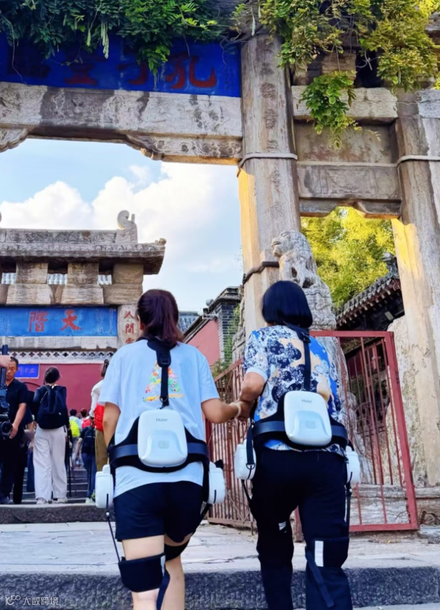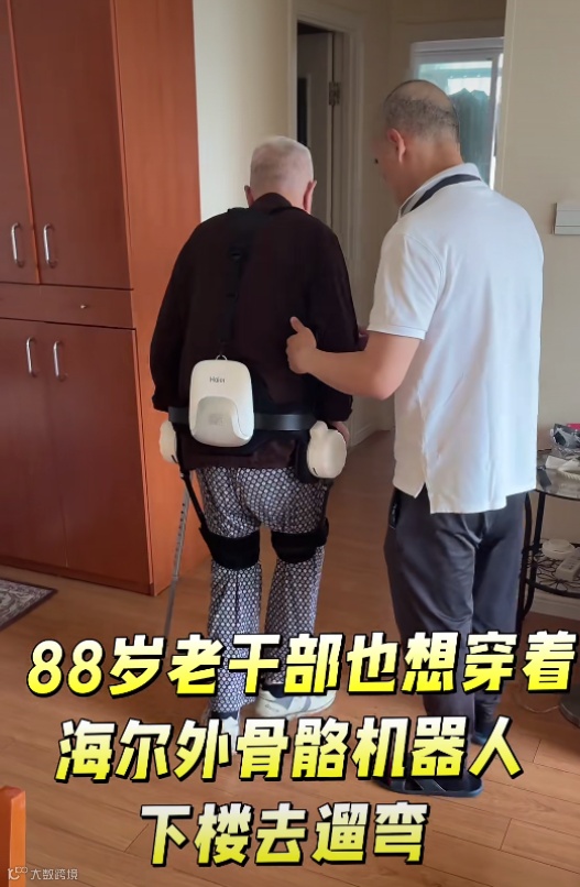 腿部力量衰退的老人穿戴轻便外骨骼,轻松上下楼梯、长时间散步,无需他人搀扶就能独立出行。