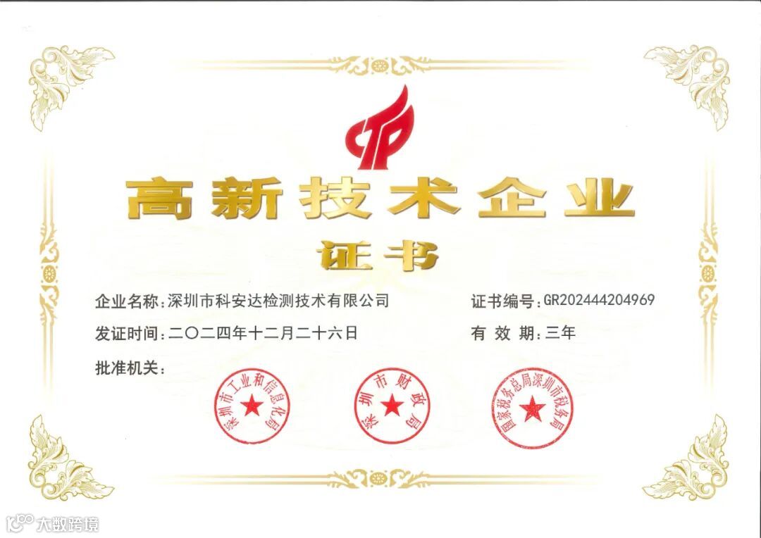 深圳科安达电子科技股份有限公司(以下简称“科安达”)及控股子公司深圳市科安达检测技术有限公司(以下简称“科安达检测”)收到由深圳市工业和信息化局、深圳市财政局、国家税务总局深圳市税务局联合颁发的《高新技术企业证书》。