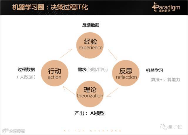 类比到机器学习领域,机器决策则是由过程数据(行动)、反馈数据(经验)、机器学习(反思)、产出模型(理论)构成的“机器决策闭环”。