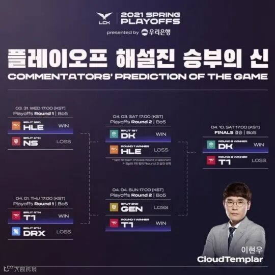 当前四大赛区中去年的冠军队伍DK展现出了极强的统治力,在LCK官方公布的韩文流解说、英文流解说、分析台解说对于2021LCK春季赛季后赛形势的预测中,11个评委有10个认为DK会夺冠。唯一的少数派则觉得,T1能够一穿三重返巅峰。