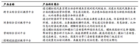 公司通过自主研发经管类专业实践教学产品和创新创业类教育产品,为客户提供经管类专业建设、实践教学体系升级、实践技能比赛和创新创业教育等人才培养方案及相关服务。