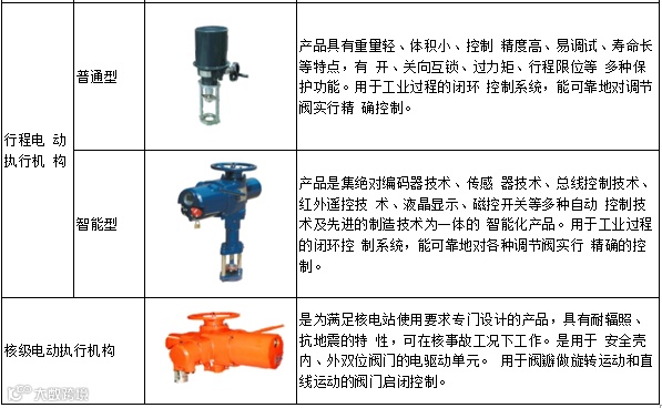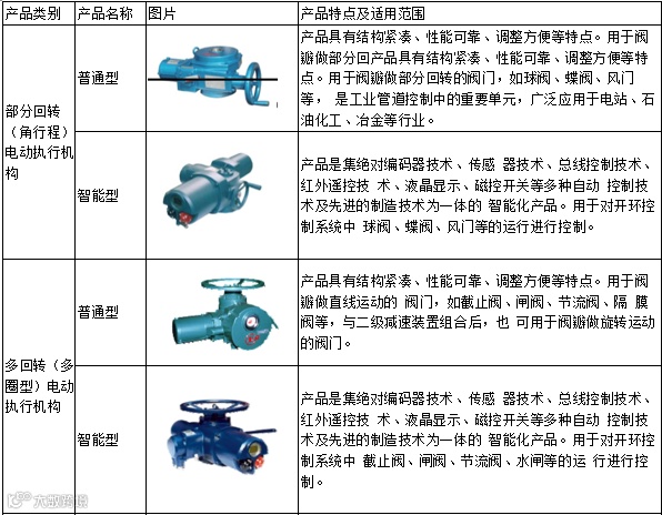 公司生产的电动执行机构产品种类较多,按照输出运动方式分类为部分回转(角行程)电动执行机构、多回转(多圈型)电动执行机构和直行程电动执行机 构三大类,按照工作环境可分为常规和核级电动执行机构二类,按照电气控制方 式可分为:普通型和智能型电动执行机构二类。
