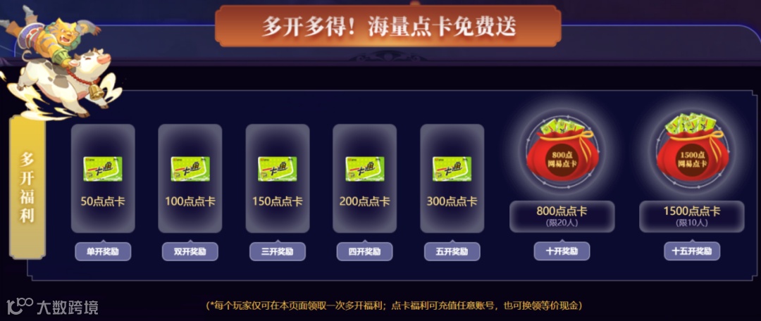 活动不仅简单,奖励也十分给力!一个号到10级就能拿50点点卡/5元现金,两个号就是100点/10元现金,多开多得,10开和15开的奖励还直接翻倍!就算挣上一千元也就是两三天的事!