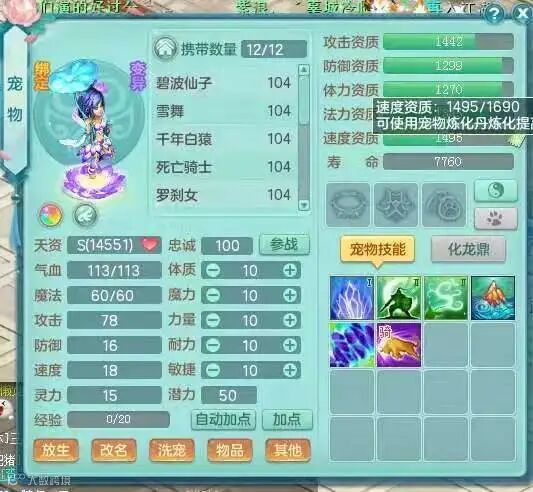 比如下面这只刚洗好的芙蓉,在拥有超过1550攻击资质的同时还有1690的速度资质,戴上饰品和进修后更是可以达到1580攻+1720速的恐怖资质。
