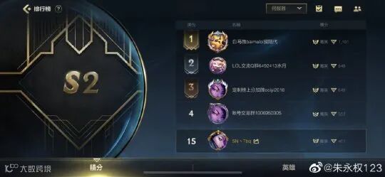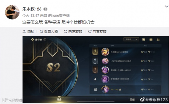 然而时过境迁,LOL手游积分榜上的排名已经不是光靠个人的实力和操作就行的了。国人最多的台服高分段如今已是导演组的天下,排名前十的账号基本都是导演组的人。即使是TBQ这样的职业选手,依靠自己的实力打到第十五名也已动弹不得。