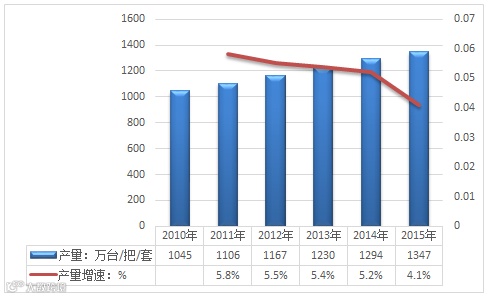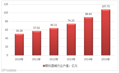智研咨询发布的《2017-2022年中国眼科器械行业市场竞争现状及投资风险预测报告》显示,眼科器械作为我国医疗器械行业的总要品类,行业产品产量从2010年的1045万台/把/套增长至2015年的1347万台/把/套。