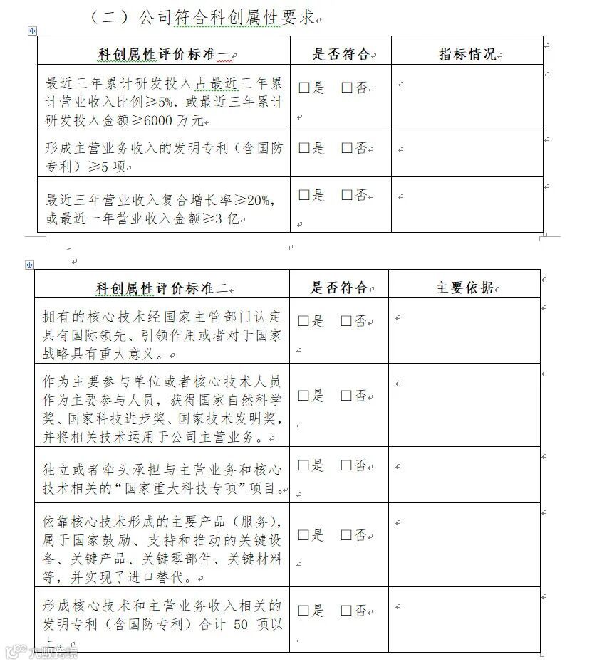 科创属性评价体系有统一格式