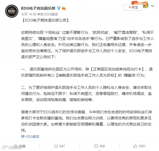 但紧接着强有力且无法辩驳的证据就出现了,EDG的官方微博在今天下午的两点三十分钟发布了新动态,表示近期有个别粉丝出现了过激和不理智的行为,具体内容就包括“航班邻座”、“餐厅酒店跟踪”、“私信不良图文”、“蹲基地围堵”乃至“动手攻击选手”。