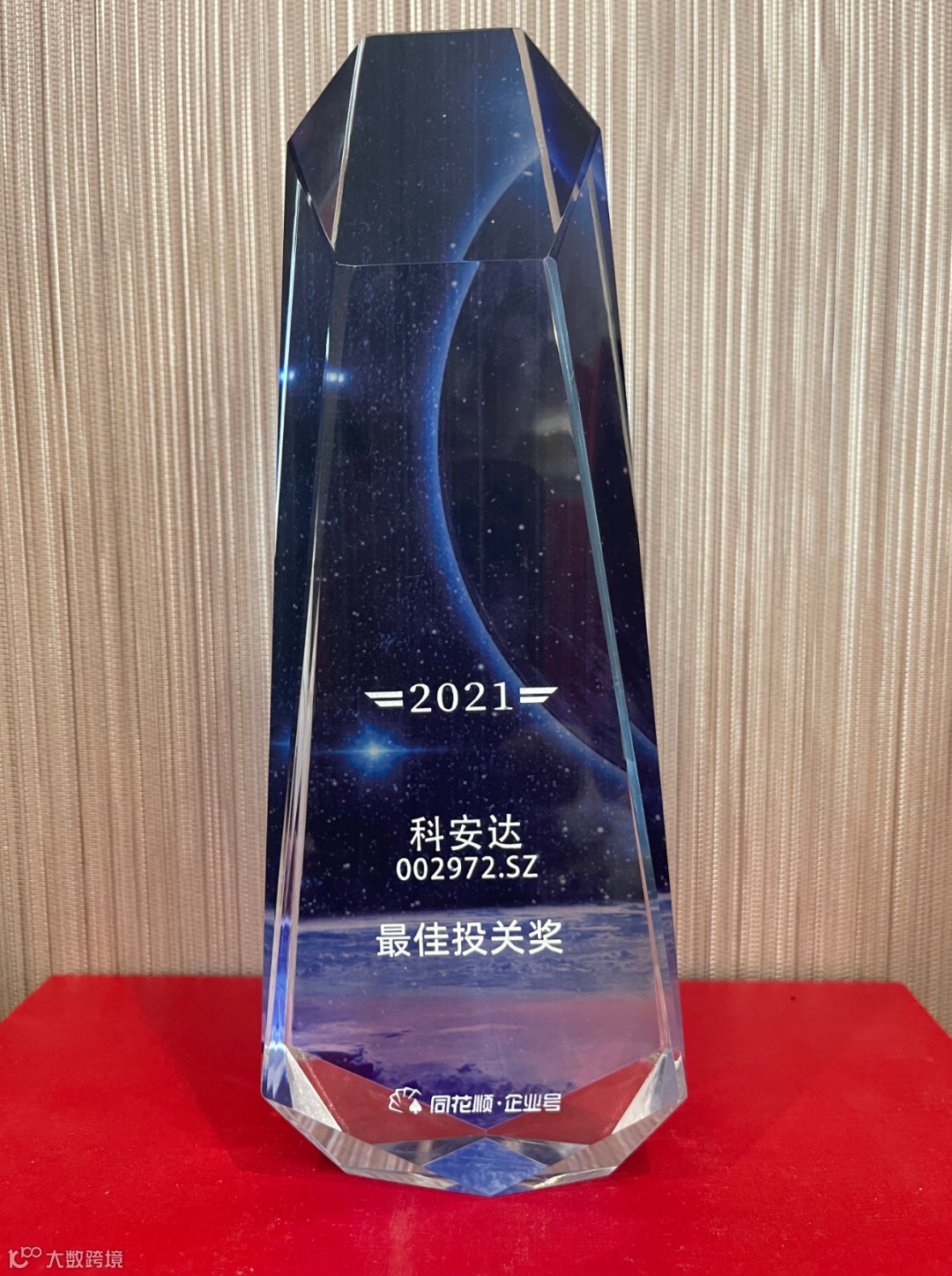 同花顺企业号2021年度榜单正式公布啦!同花顺企业号2021年度榜单涵盖“最具影响力奖”、“最佳投关奖”、“投关先锋奖”、“最佳组织奖”共四大类奖项。热烈祝贺科安达荣获“最佳投关奖”!