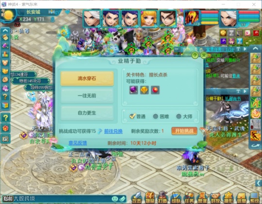 【业精于勤】活动有点类似36天罡星,分为普通、困难、大师三个难度,选择的难度越高奖励越高。普通难度大概相当于副本的难度,困难难度大概相当于普通36的难度,大师难度大也就是概相当于魔36的难度,大家可以大胆去打。