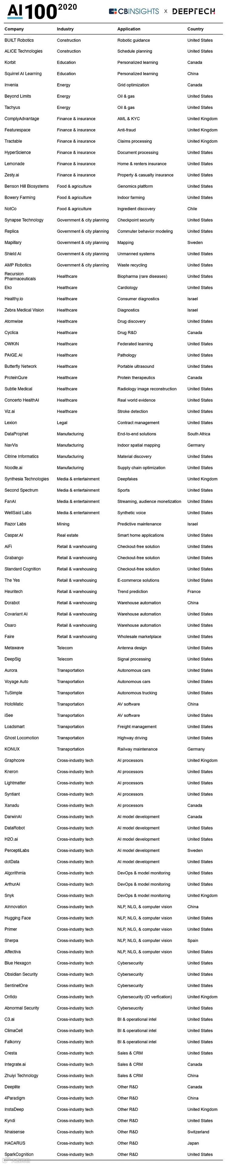 近日,全球知名创投研究机构CB Insights发布了2020全球AI百强创业公司榜单“AI 100”,遴选出了2020 年全球 100 家最有前景的人工智能公司。凭借AI产业化落地的出色表现,第四范式继去年后再度入选,成为连续两年位列该榜单的中国公司。