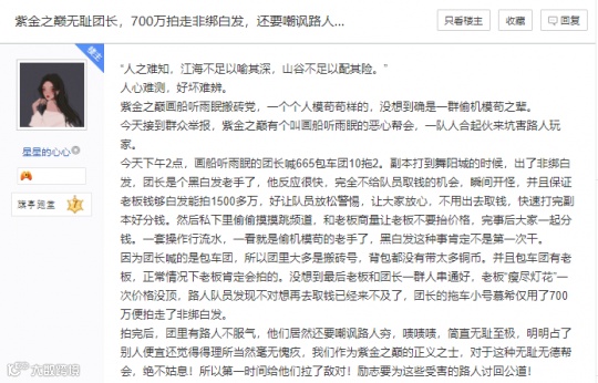 等拍完后,团里的其他玩家才发现上当了,突然反应过来,原来团长“秋夕”就是利用搬砖党出门背包里没带太多铜币这一点,瞬间开怪拖住队员,原本说好的保证老板1500万拍卖价,结果700万被老板“瘦尽灯花”拍走,“画船听雨眠”帮会自己人分钱去了。