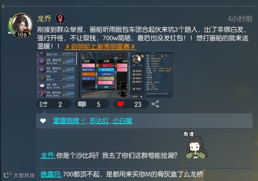 根据玩家讲述,更为过分的是,当团里的路人玩家骂骂咧咧,团长“秋夕”还嘲讽“组野队”的路人队友穷,700万都顶不起。正义网友看完表示很愤怒,组了想打画船的队准备去送温暖。