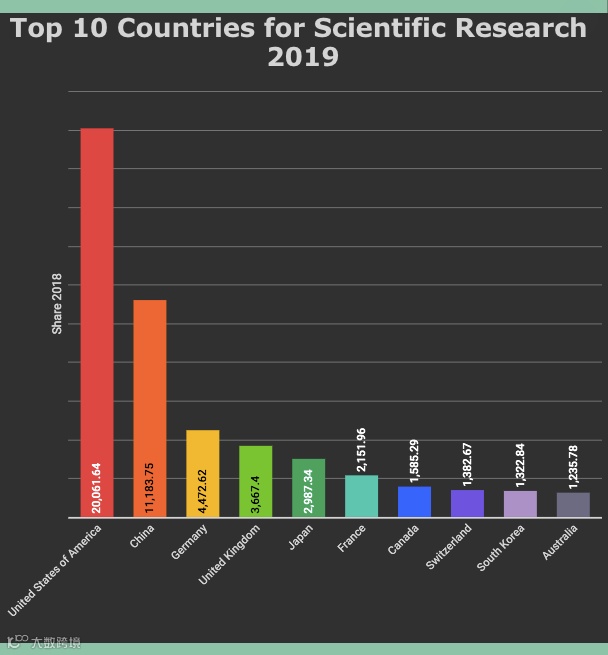 科学研究十大国家:美国第一,中国增速明显位列第二