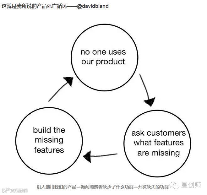 要跳出产品死亡循环其实并不容易,因为处在这个循环中的人往往认为自己在做正确的事情——听从用户需求、满足用户需求。但是,正确的动机并不一定会带来好的结果,满足了用户对某个特定功能的需求并没有真正帮他们解决问题。你所应该做的,就是不断地刨根问底,理解阻碍产品发展的根本原因是什么。