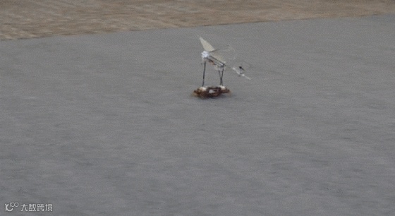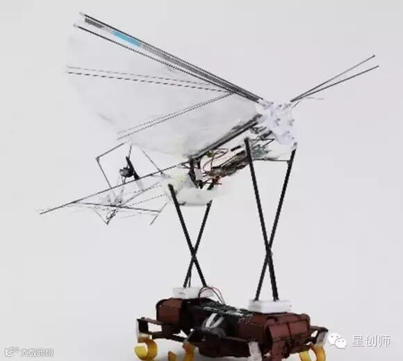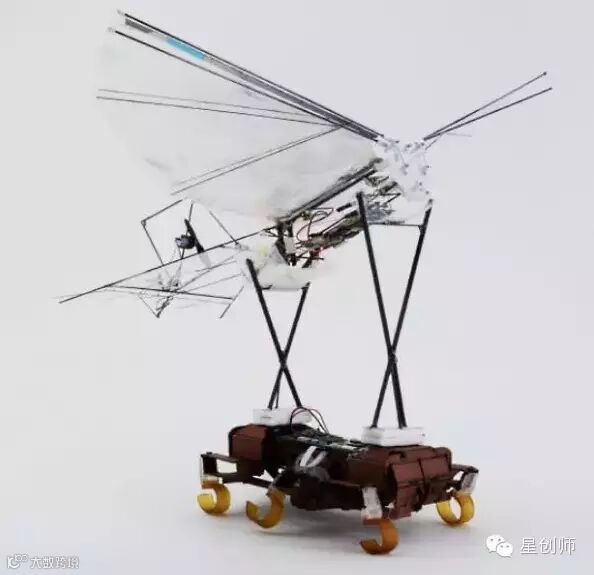 题图中的地面机器人就是加州大学伯克利分校研发的VelociRoACH,通过助跑其上方的H2Bird扑翼微型飞行器能成功从载具框架上起飞。H2Bird 的重量仅仅只有13克,可以飞行一分钟半钟,美中不足的是它结构十分脆弱,无法自行降落到地面,需要达到1.3m/s的速度与35至40度的起飞角度才能顺利起飞。
