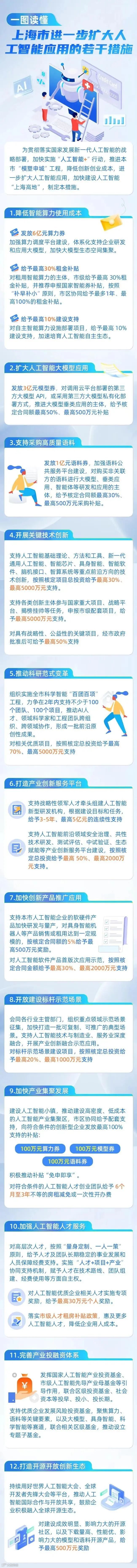为降低智能算力使用成本,上海发放 6 亿元算力券,加强算力调度平台建设。对租用智能算力的主体,市级给予最高 30% 租金补贴,还推荐申报国家智能券补贴,按照 “补早补小” 原则,市区协同给予最多 1 年、最高 100% 的租金补贴。对自主智能算力设施部署项目,给予最高 10% 建设支持 。这一系列举措,极大地减轻了企业在算力方面的负担,让企业能够将更多资源投入到技术研发与创新应用中。