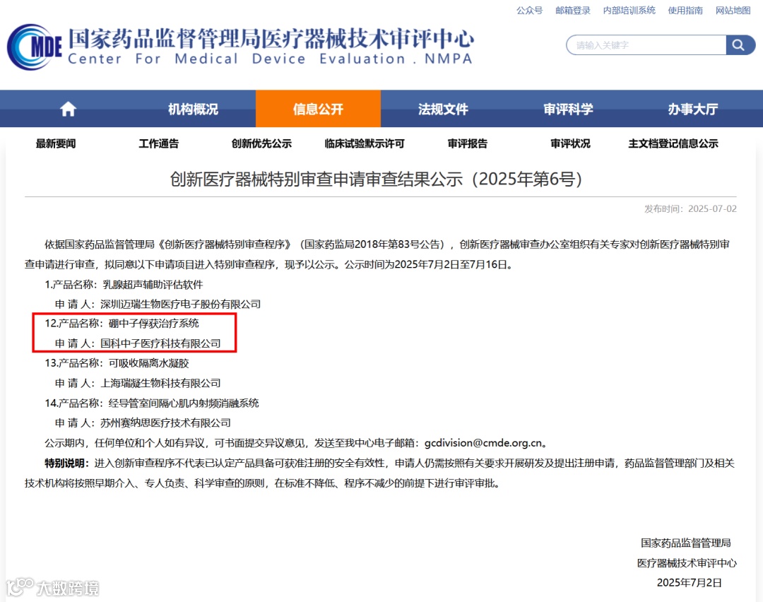 近日,国科中子医疗科技有限公司“硼中子俘获治疗系统”正式获批进入国家药品监督管理局医疗器械技术审评中心创新医疗器械特别审查程序(绿色通道)。该设备是我国首台具有完全自主知识产权的临床BNCT系统,符合国家在高端医疗装备领域鼓励自主创新和加快审评审批的政策导向。