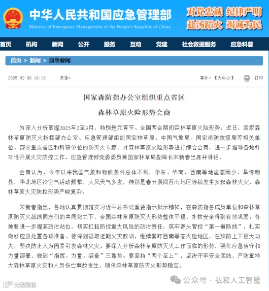 为深入分析掌握2025年2至3月,特别是元宵节、全国两会期间森林草原火险形势,近日,国家森林草原防灭火指挥部办公室、应急管理部组织国家林草局、中国气象局、国家消防救援局等相关单位、部分重点省区和科研单位的防灭火专家,对森林草原火险形势进行综合会商,进一步指导各地针对性开展火灾防控工作。