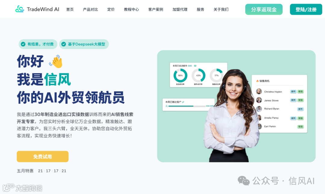 3. AI智能体可以做到每周全自主搜索客户+联络客户,无需过多人力干预。同时,AI的兴起也带来了付费模式的变化,从之前卖工具到现在交付结果,以结果付费。举个例子,AI成功发送的1000封邮件中,客户可能点开或回复了400封,信风将只计算400封的用量,剩余600封用量AI会持续帮外贸员找新的客户。