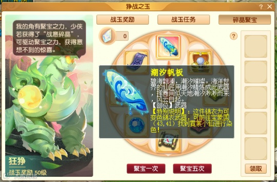 随着战玉等级的提升,玩家可以收获【战玉碎晶】,【战玉碎晶】可以参与抽奖,有概率获取【潮汐帆板】武器装饰。