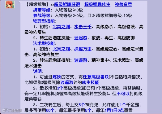 超级鲲鹏消息刚出来的时候,非常多玩家以为这只神兽要逆天了,不但能秒10,还带超级逆天的特殊技能。不过在更新之后,梦幻精灵已经注明,超级鲲鹏不能打须弥真言。