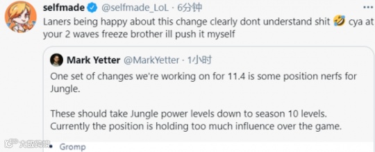 换言之,在11.4版本过程中,节奏型打野英雄将会面临巨幅削弱,无法承担起团队核心的责任,只能沦为团战的工具人,而各大职业战队的野核战术更是会被设计师这一刀重砍,被直接废掉。因此,面对LOL设计师如此儿戏的版本改动,FNC打野Selfmade主动发文炮轰了他们的睿智操作。