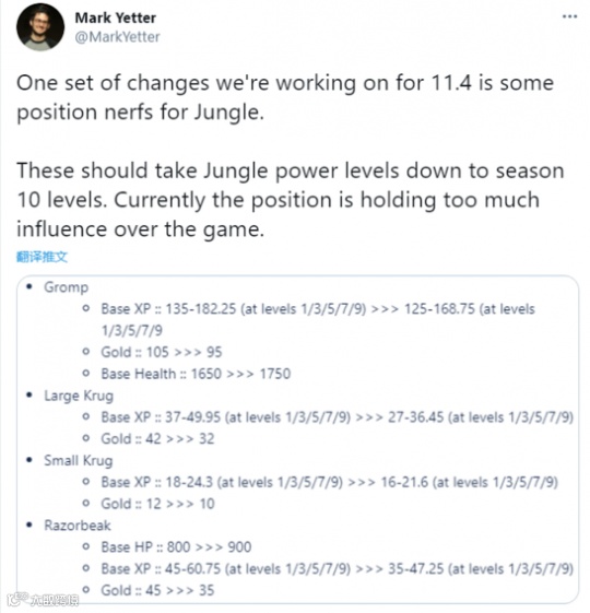 就目前LOL设计师所公布的调整方案来看,野区所能提供给打野的整体经济与经验值将被削弱六分之一左右,而野怪的生命值则会被提升七分之一左右,这就代表了打野需要在野区花费更多的时间去获取更少的经验与金币。不论是对于路人局玩家,还是职业选手而言,都将意味着打野的等级与装备会大幅落后线上英雄,尤其是在6级这个关键时间节点上,打野有可能会与单线英雄产生两到三级的差距,首件神话装备的完成效率更是会大幅于线上英雄。