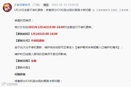 好在今天下午,王者荣耀官方火速发布了公告正式宣布将会在15:00——16:00对全服进行不停机更新。而更新的原因则是为了上面所提到的,“修复部分IOS机型出现的画面卡顿问题”,这才让玩家们的情绪有所缓和。
