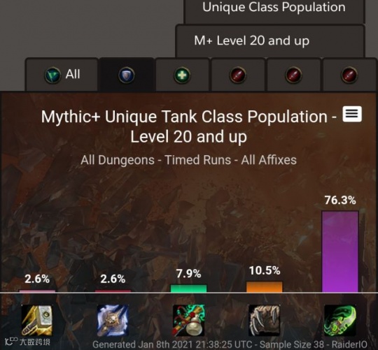 实际上在Raider上20层以上数据里看不到防战,是因为真的没有防战能打上去。真正在游戏里能够打到20层以上限时的队伍十分稀少,从数据上看起来像是10%的差距,可能就是四五个人而已,四舍五入记数本身就会出现汇总不是100%的情况。如果你翻遍Raider.IO的详细队伍,你会发现真的没有防战能打上20层。