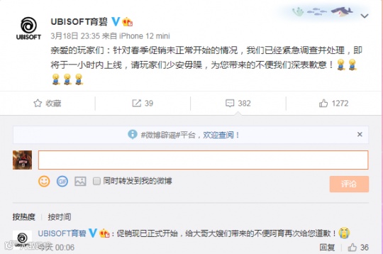 育碧官博数天以前预告的春季促销活动,在3月18日当天却出了岔子。直至当晚23点35分官方才发出了一条新公告,确认本次的春季促销活动由于出现了技术性问题才没能准时上线。