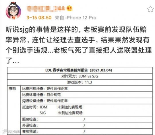 根据网友爆料的消息来看,这一次LDL联盟重拳出击的态度,极有可能与SJG战队老板自查队伍赔率异常,举报个别选手假赛违规有关。该次举报的结果,直接令SJG俱乐部无法派遣5位有资格的选手参加比赛,被提前判罚输掉LDL比赛。