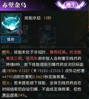还有就是“赤壁金乌”技能到底是手动引爆还是等它自己炸好呢?从技能描述详情我们计算出,自动引爆的话就是20秒CD,造成154%的伤害,手动按的话就是12秒CD,造成100%伤害,这样算下来的话还是手动按的秒伤比较高。