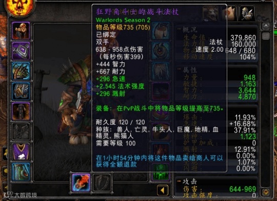 玩过6.0的玩家们印象最深的肯定是要塞系统了,但其实WOD版本里暴雪有过很多非常有创造性的设计,PVP装备缩放系统就是其中之一。6.0的PVP非常火爆,阿什兰的人气非常高,而且PVP没有影响到PVE。因为PVP的装备会根据不同环境改变装等和属性,比如下图里这个PVP武器,在PVE环境里装等是705,在PVP环境里装等是735。