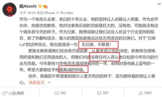 首先是TES俱乐部的战队管理郭皓在发小作文,劝导粉丝们理性看待主教练的离任,并表示“无兄弟,不联盟”,TES内部没有任何人否认主教练的付出与贡献,也为他的未来送上最真诚的祝福。简而言之,就是TES内部对于主教练的离队十分遗憾,希望能引导粉丝看到白色月牙的闪光点,并暗示了他的出走受到了多方面因素影响。