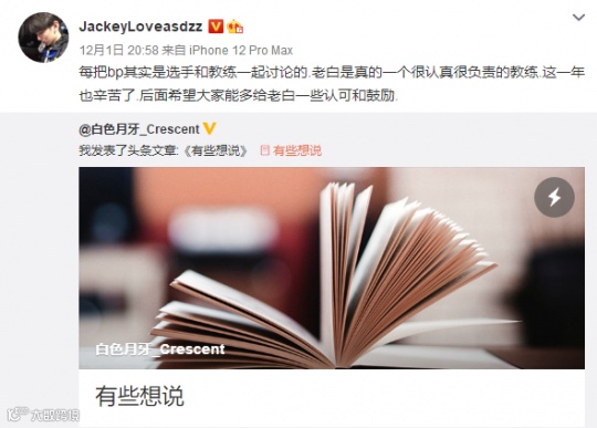 总之,从白色月牙老婆的视角来看,是TES俱乐部不顾恩情主动踢掉了白色月牙。当然由于我们不是当事人,也无法对于内部情况有所了解,但从TES选手阿水的发言来看,却也可以看出某些“窝里斗”的迹象。阿水在白色月牙发布卸任感想后,转发并公开评论道“每把bp其实是选手和教练一起讨论的,老白是真的一个很认真很负责的教练,这一年也辛苦了,后面希望大家能多给老白一些认可和鼓励。”