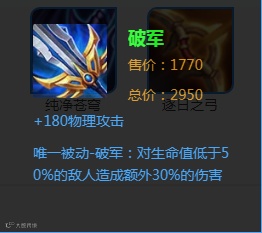 经过玩家们在实际对局中的总结不难发现,通常那些0-7超鬼的吕布,基本都是裸出破军的狠人。但破军作为王者荣耀游戏中最贵的攻击装备之一(仅次于破晓),合成路线又不够平滑,往往两把大剑刚憋出来,游戏就已经结束了。