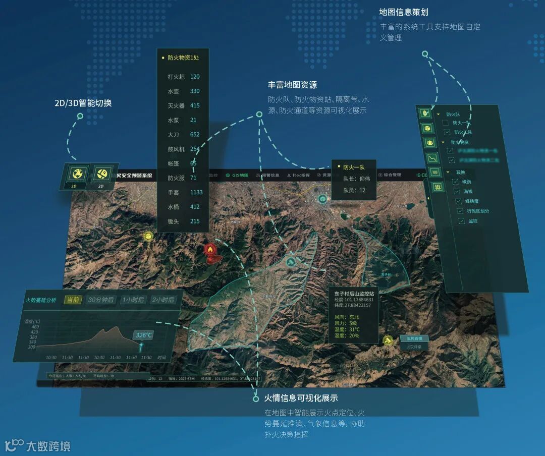 通过采集、存储、标记、管理、分析、显示与应用地理测绘数据,智能展示管辖区域分布的监控、气象、物资、防火队等数据信息。火情发生时,实时掌控火点位置信息、火势蔓延趋势、风向变化数据,以及周边人员、物资分布情况,为扑火指挥提供有力依据。建立森林地理空间数据库,运用先进的数字化管理方法,科学管理森林资源。