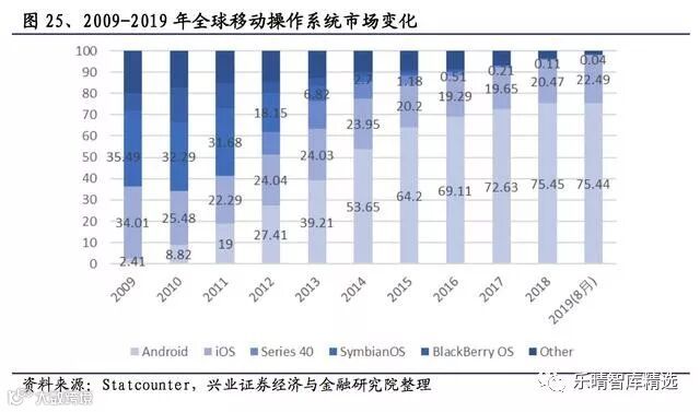 iOS在这十年间的市占率也在逐步下降,在2016年达到最低点(19.29%),之后有所回升,到2019年8月市占率达到22.49%。而Android移动操作系统则是一路高歌猛进,到2019年8月贡献了75.44%的市场份额,拥有绝对的垄断地位。