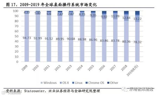 过去10年,Windows操作系统的市占率快速下滑,2009年,Windows以94.73%的市场地位,绝对垄断着操作系统行业,10年间,市场份额持续下滑近20%,其中,主要竞争对手来自于苹果公司的OSX,贡献了9%的市场份额。
