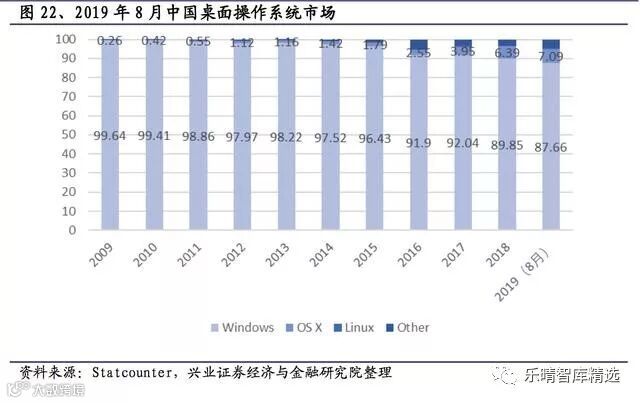 中国市场,依旧是微软Windows单家独大。截至2019年8月,Windows与OSX占据市场超过94.75%,Linux仅占0.79%的市场份额,Wintel架构之外的桌面操作系统具有巨大的市场潜力。